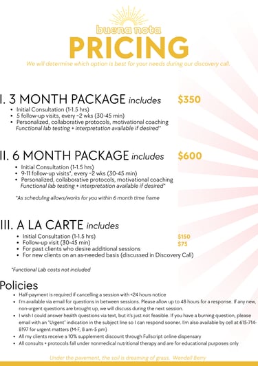My goal with every client is to be as efficient & effective as possible. I cater each protocol to your bioindividual needs, incorporating my background in herbalism, nutritional therapy, the culinary arts, and functional medicine.