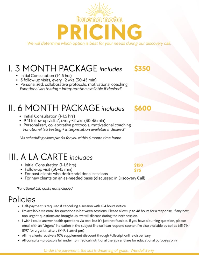 We're fortunate to live in a time where we have access to so many incredible labs. Comprehensive Stool Assays, OAT (Organic Acid Test), DUTCH hormone panel, Nutragenomics, Micronutrient Assays, & Continuous Glucose Monitors are some of my favorite tools. These aren't essential but available to you.